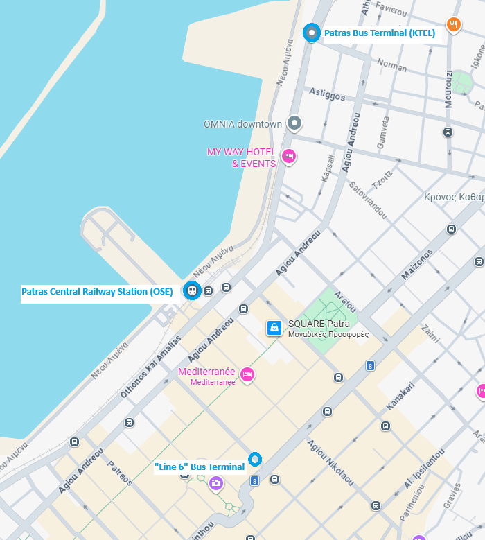 In the following map, you can see the exact location of “Patras Bus Terminal (KTEL)”, “Patras Central Railway Station (OSE)” and “Line 6” bus terminal.